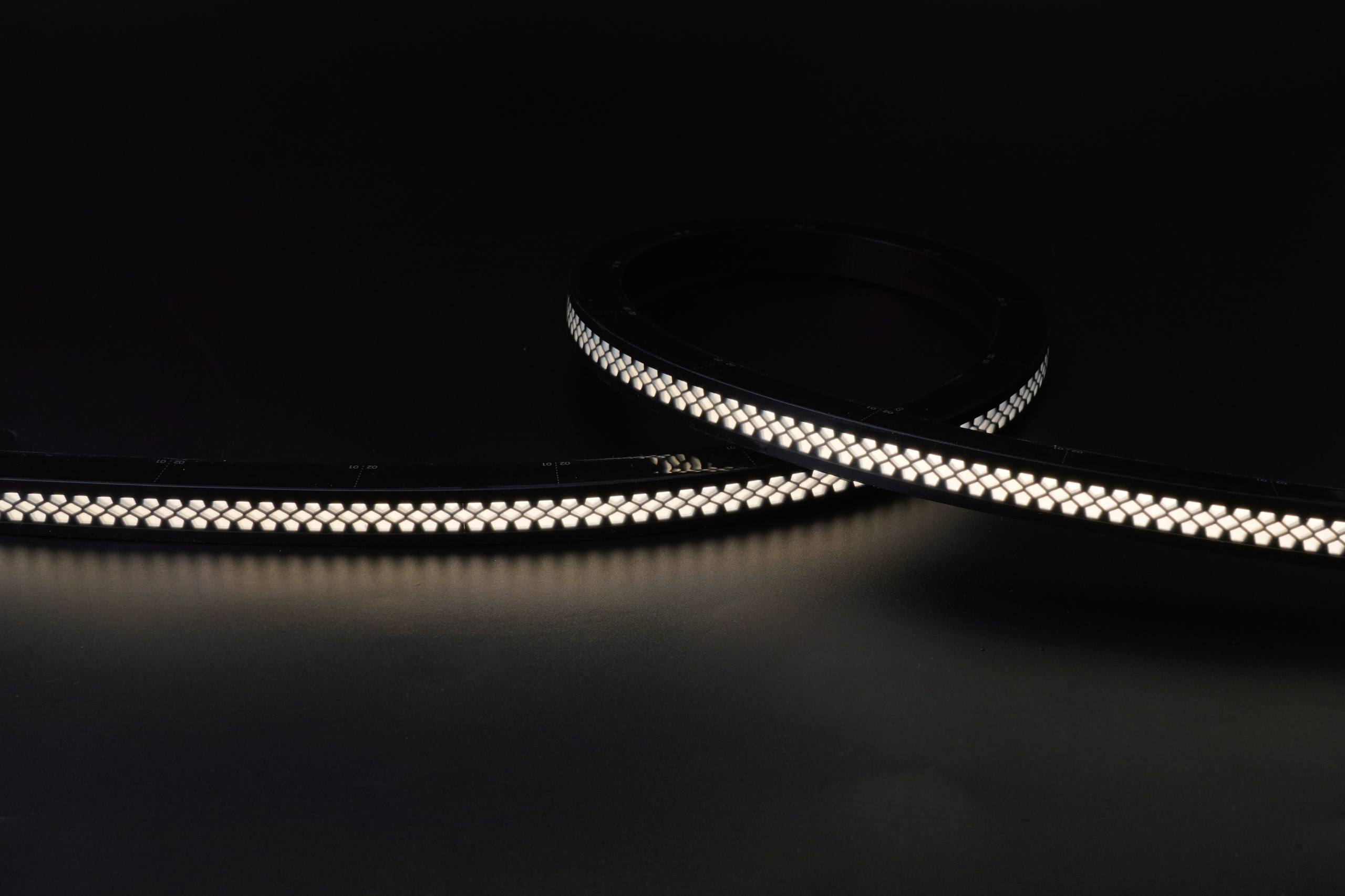 The UGR<19 neon flex with special design and black strip body&emitting surface, suitable to the space need lower brightness, top view and vertical bending with min bending diameter 200mm, cross section is W16xH17mm,integral or silicone endcap, front/side/bottom entry optional, 10W 28LM/M 2.8LM/W,single color 1800-6500K, max run length 15M from one end without noticeable voltage drop, standard reel length is 5M and customized length optional.
